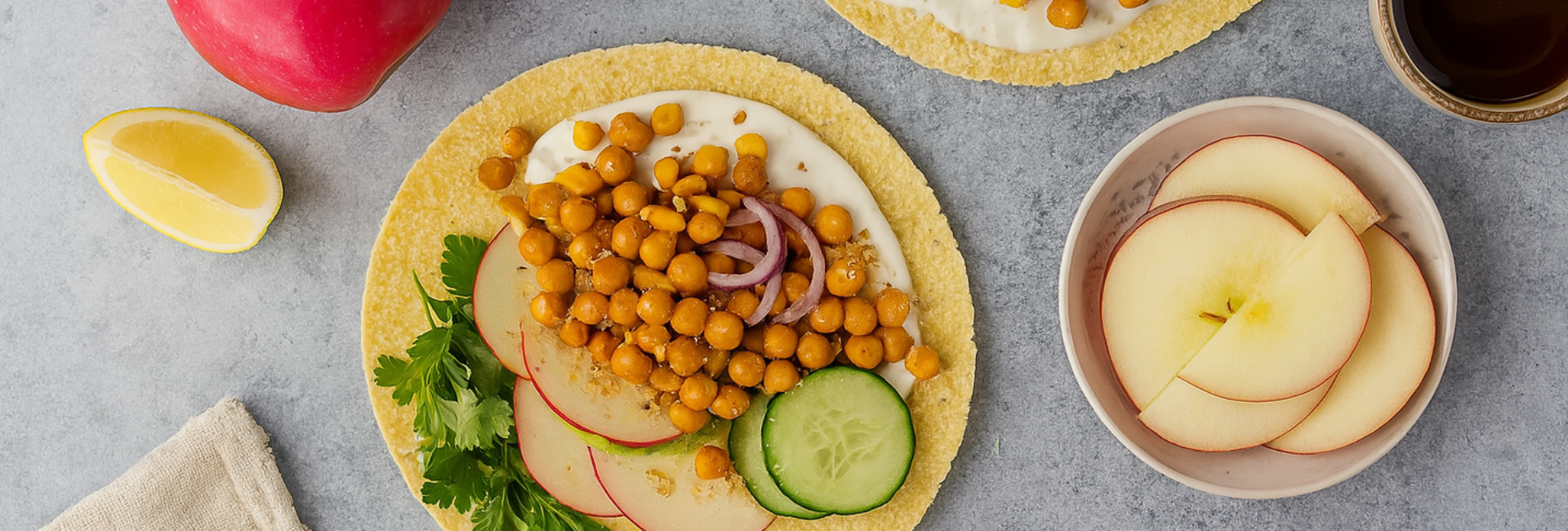 De knapperige Pink Lady®-appels, maïs, kruiden, limoen en zachte tortilla’s vormen alle ingrediënten voor een smaakvolle maaltijd, alsof je even op reis bent. Simpel te serveren en perfect voor een lichte lunch of een gezellig vegetarisch diner.